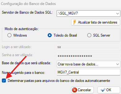 Para utilizar um banco de dados em nuvem, é necessário marcar a opção de "Determinar pastas para arquivos do banco de dados automaticamente" na